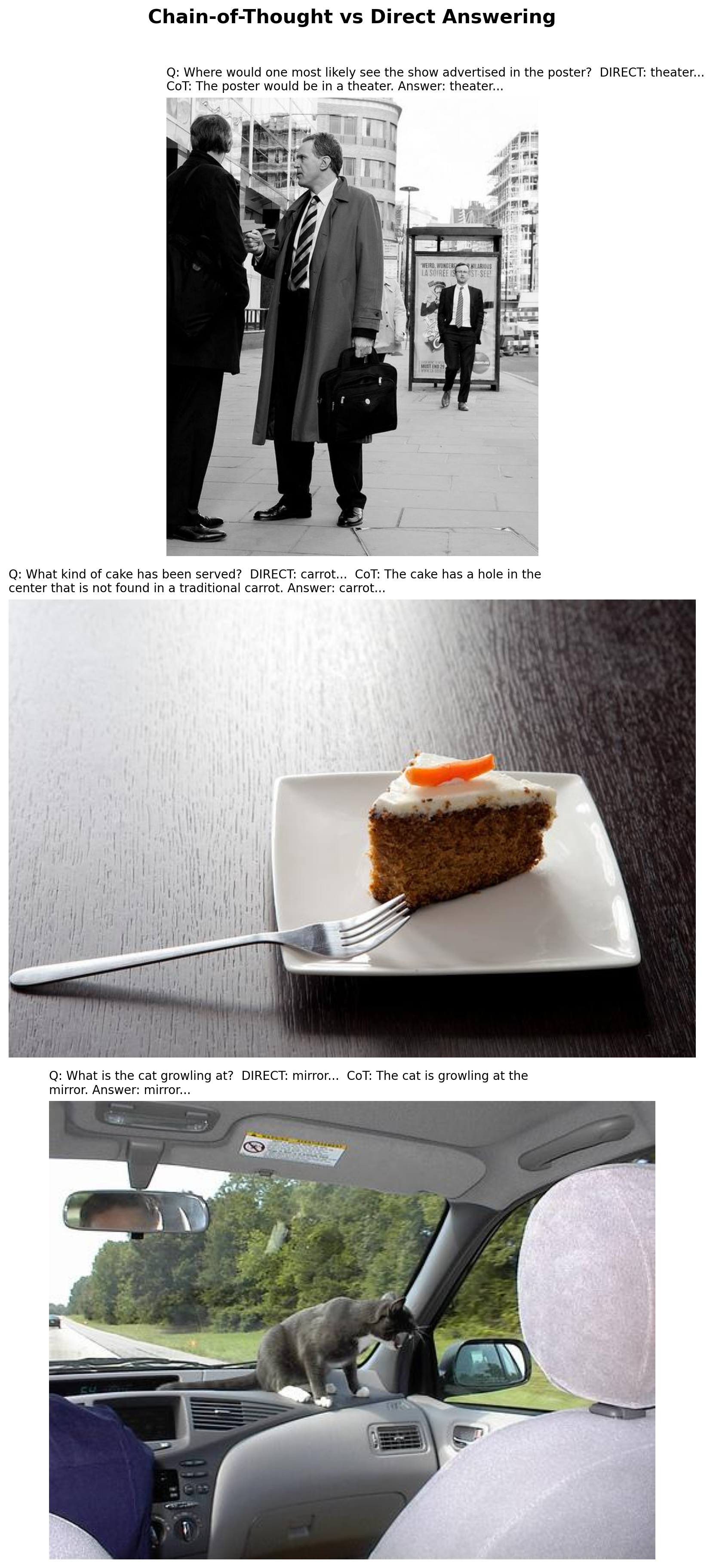 - Evaluation - Compared CoT vs direct answering