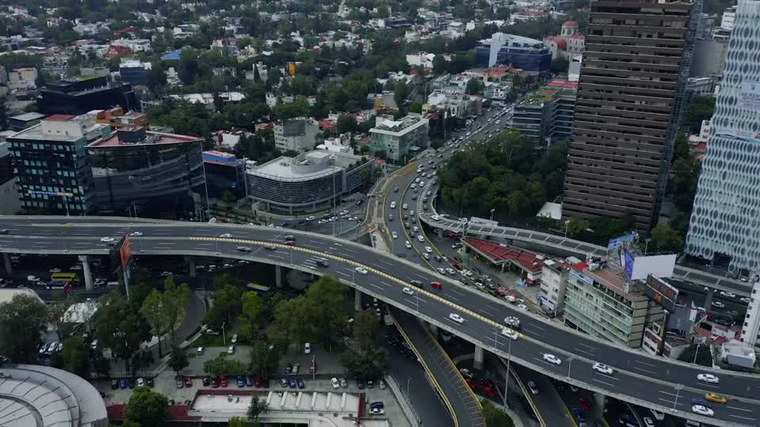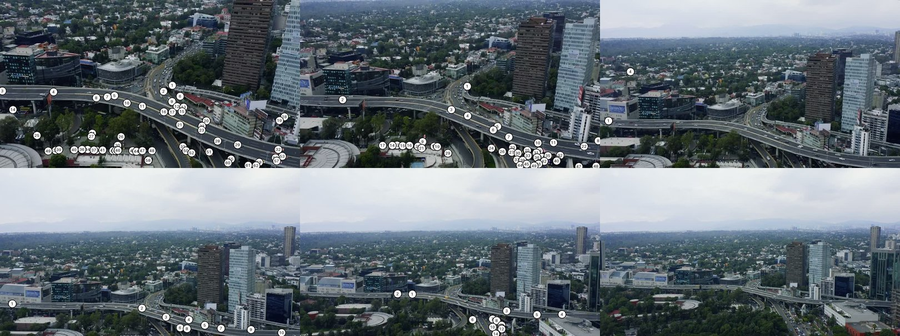 The clip is a 44-second aerial drone pan over a highway overpass in Mexico City (Mixkit, free license). Six evenly-spaced frames.