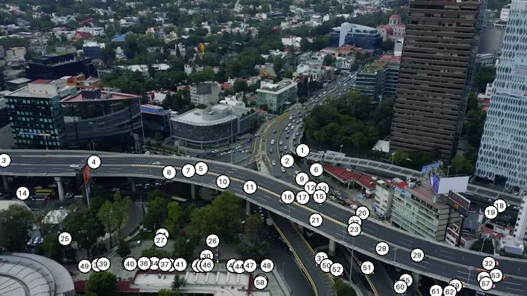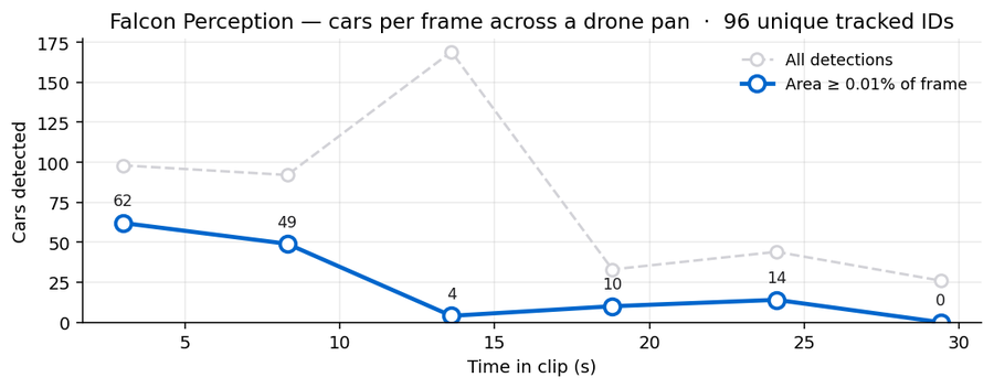 Call Falcon Perception on each frame with the expression "car". Falcon returns masks + centroid + area for every match; we filter anything smaller than 0.015% of the frame (aerial cars are tiny, but sub-that-threshold blobs are overwhelmingly noise).