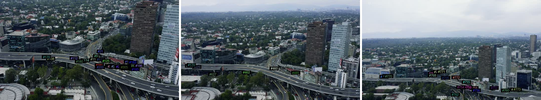 ...Three frames sampled across the clip — same #173-style track ID format, but observe how rarely a number persists from one panel to the next. The drone is panning fast enough that almost every car earns a new ID.