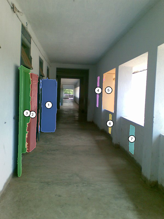 There are 3 doors visible on the left wall and 4 window openings on the right wall of the corridor.