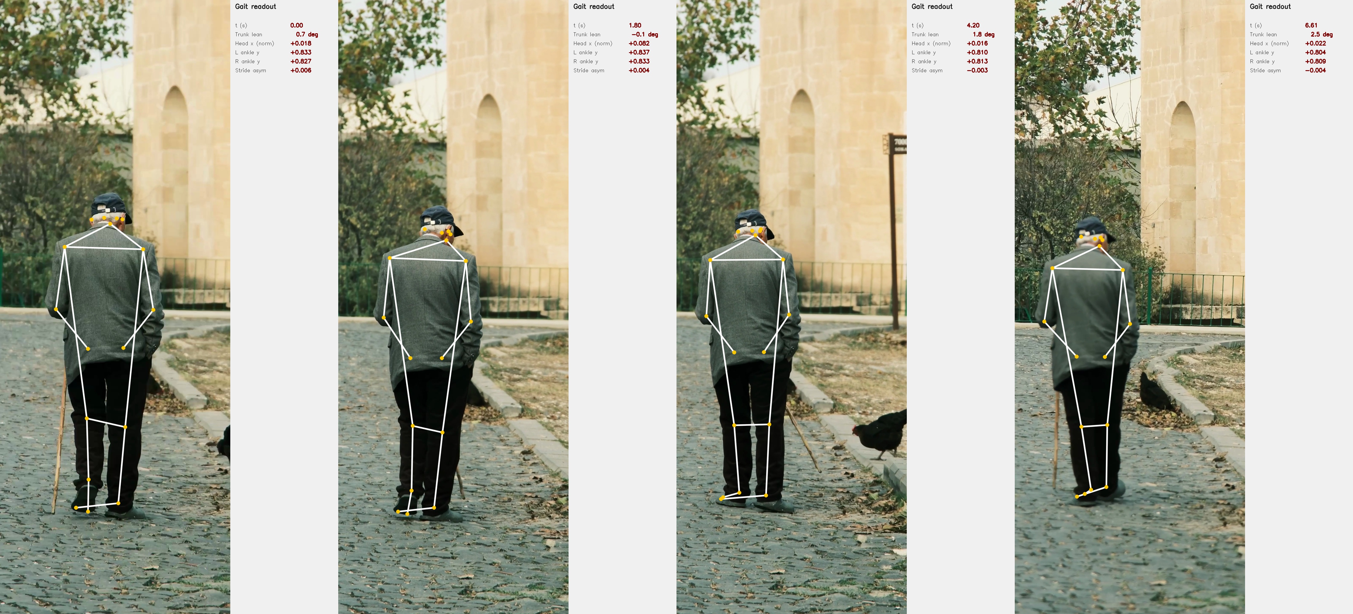 | Fall-risk gait screen | trunk-lean + stride-asymmetry time-series | longer videos + foot-strike detection |