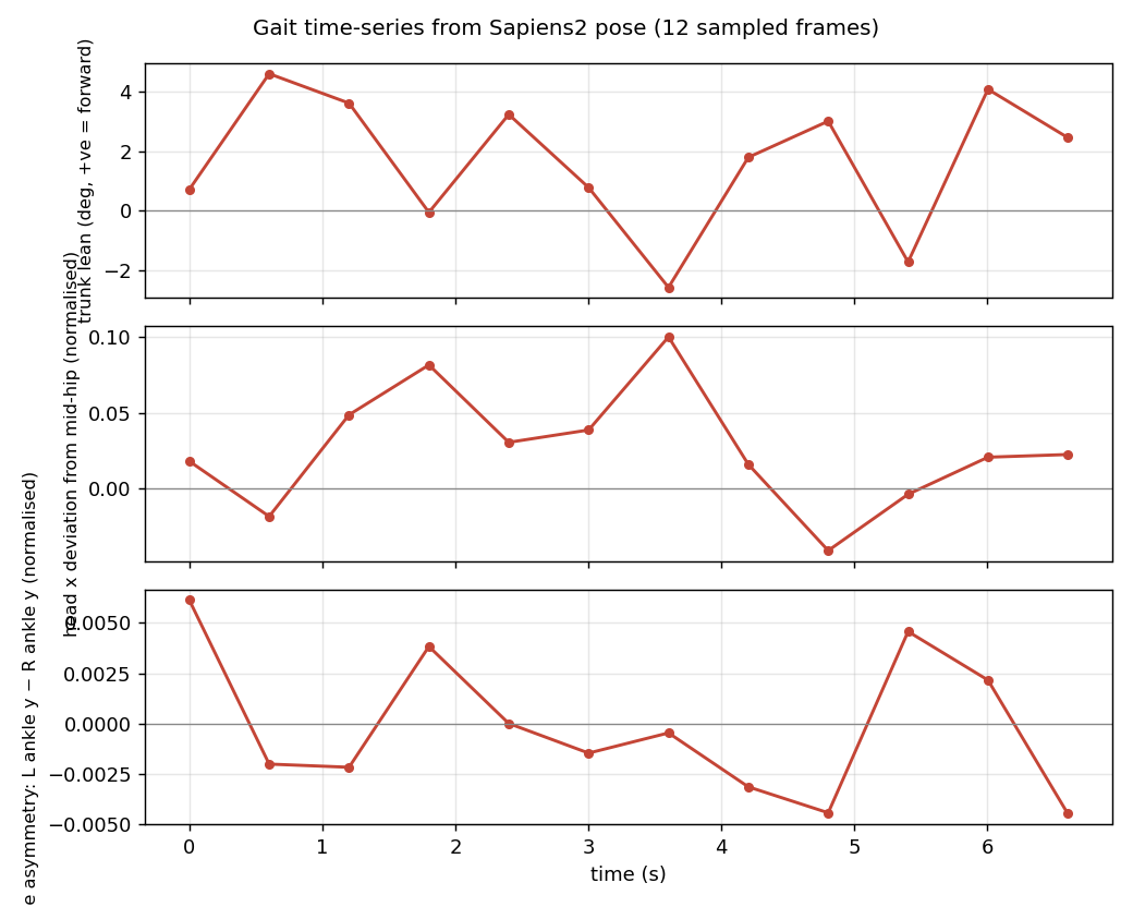 - Gait analysis on video — trunk-lean and stride-asymmetry time-series across a 12-frame walking clip.