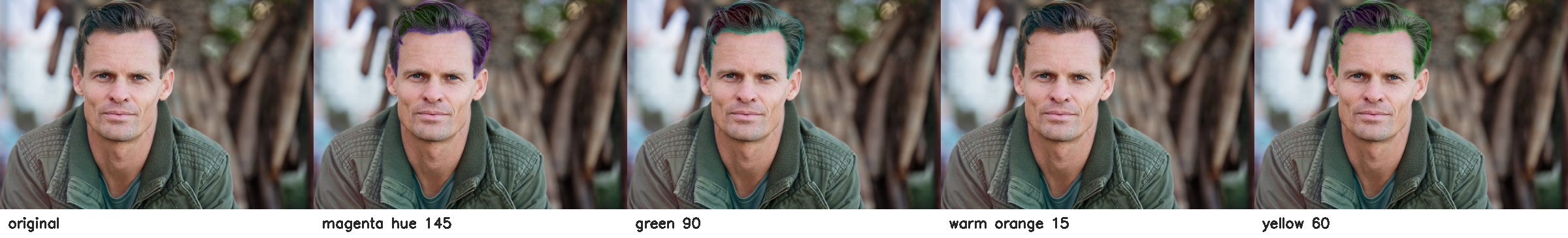A 5-line HSV rotation confined to the seg “Hair” class — included here only because it is the kind of thing UX teams ask for from the same primitives a clinical pipeline uses. Same plumbing, different rubric: