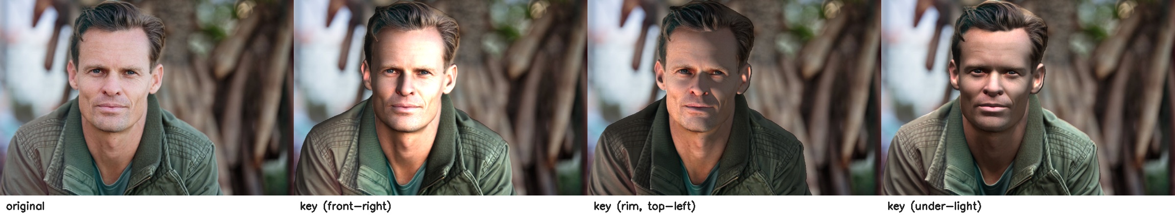 person1 under three light directions. The relighting is confined to the seg-foreground, so the backdrop is untouched and there’s no halo. The shading change reads correctly as 3D — right-cheek shadow under the front-right key, left-rim highlight under top-left, inverted shadow under the chin for under-light.In a clinical context this is the mechanism behind a standardised photography pipeline — patient takes a picture under whatever ambient light, and the downstream system relights to a canonical orientation before passing the image to a classifier (or to a human reviewer who needs a fair before-and-after comparison).
