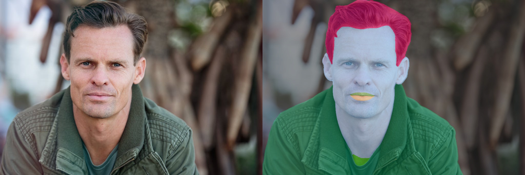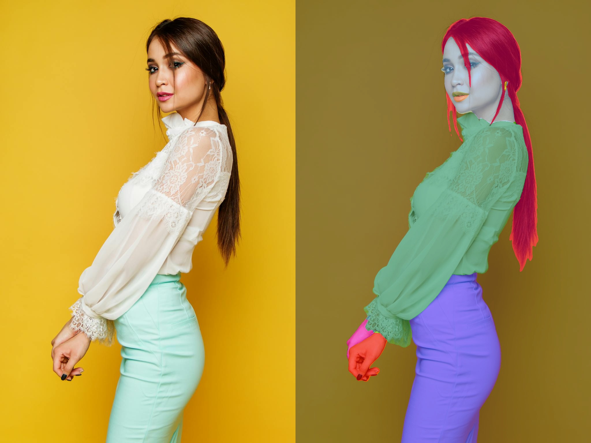 - Selective hair recolour — HSV rotation confined to the seg “Hair” class.
