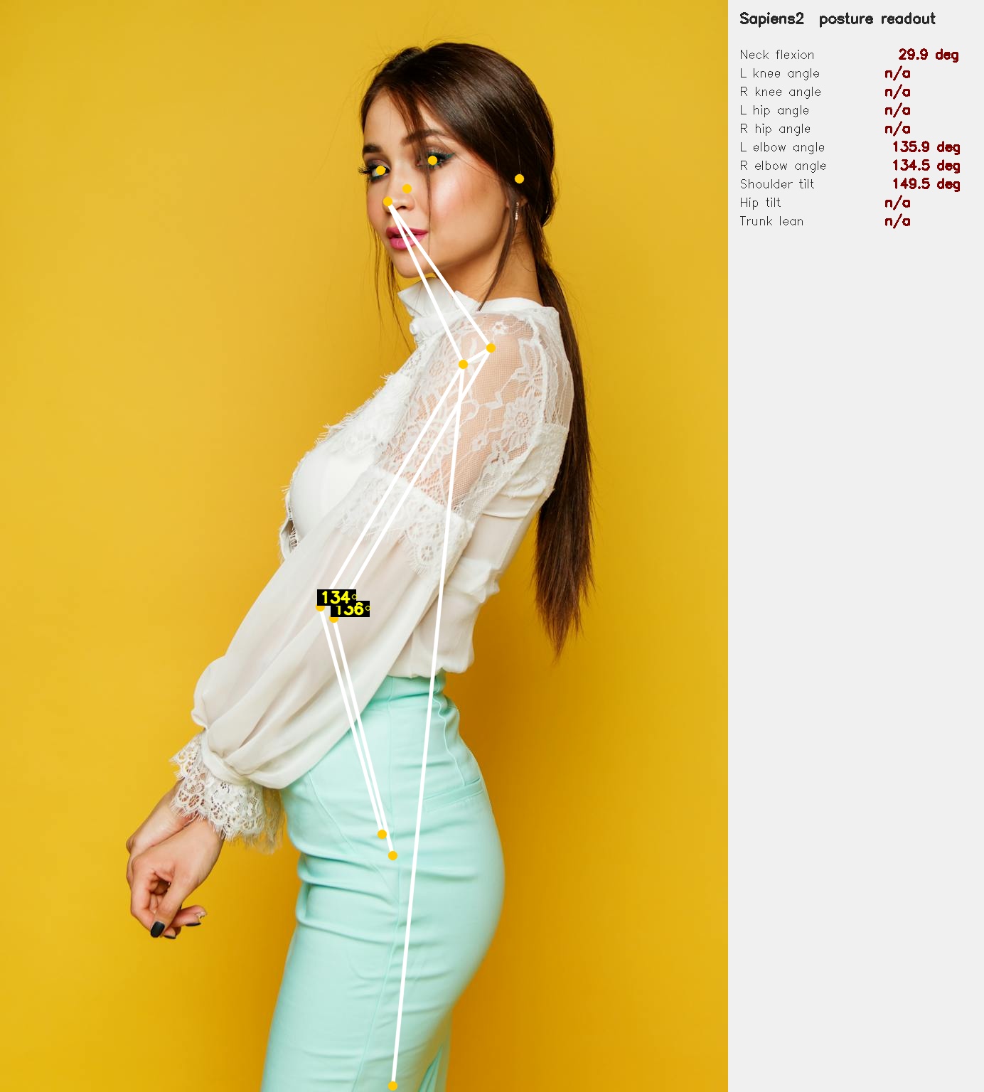 - Workplace ergonomics — an office worker hits a “snapshot” button; the readout flags neck-flexion > 30° as a long-term repetitive-strain risk.
