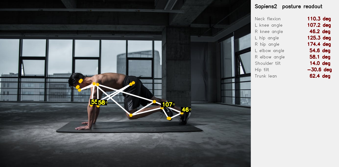 - Joint-angle readout — knees, hips, elbows, neck flexion, trunk lean from pose keypoints.