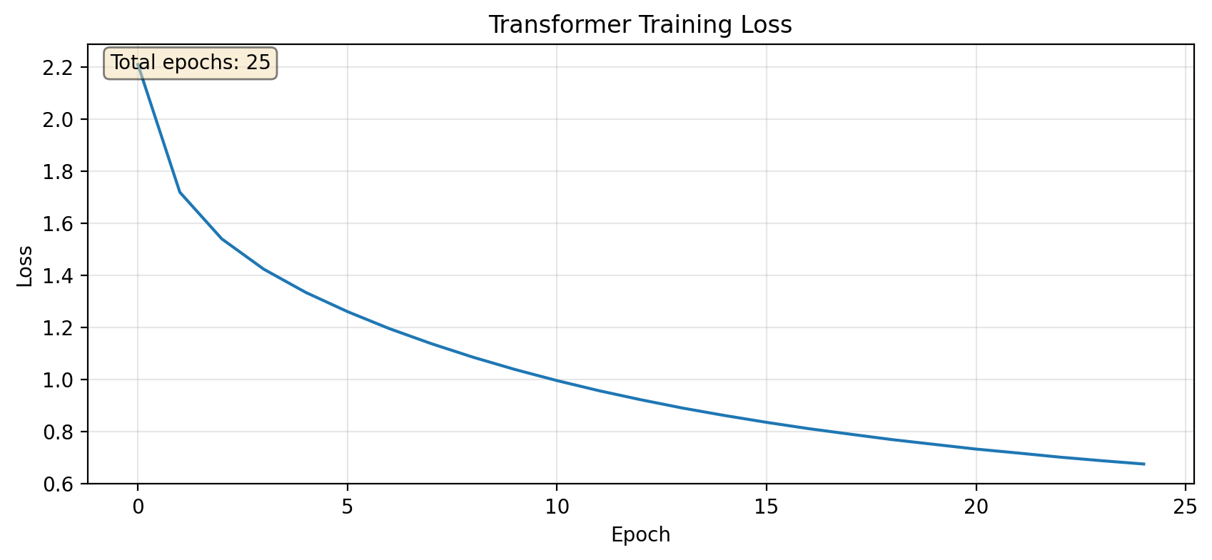 def train(model, X, Y, epochs=500, batch_size=64, lr=3e-4, checkpoint_path='../models/checkpoint_part4.pt', resume=True):""" Resumable training with checkpoint saving. Args: resume: If True, attempts to resume from checkpoint checkpoint_path: Path to save/load checkpoints """ model.train() optimizer = torch.optim.AdamW(model.parameters(), lr=lr) X, Y = X.to(device), Y.to(device) losses = [] start_epoch =0# Try to resume from checkpointif resume and os.path.exists(checkpoint_path):print(f"Resuming from checkpoint: {checkpoint_path}") checkpoint = torch.load(checkpoint_path, weights_only=False) model.load_state_dict(checkpoint['model_state_dict']) optimizer.load_state_dict(checkpoint['optimizer_state_dict']) start_epoch = checkpoint['epoch'] +1 losses = checkpoint['losses']print(f"Resumed from epoch {start_epoch}, previous loss: {losses[-1]:.4f}")for epoch inrange(start_epoch, epochs): perm = torch.randperm(X.shape[0]) total_loss, n_batches =0, 0for i inrange(0, len(X), batch_size): idx = perm[i:i+batch_size] x_batch, y_batch = X[idx], Y[idx] logits = model(x_batch) loss = F.cross_entropy(logits.view(-1, vocab_size), y_batch.view(-1)) optimizer.zero_grad() loss.backward() optimizer.step() total_loss += loss.item() n_batches +=1 losses.append(total_loss / n_batches)# Print progressif epoch %10==0:print(f"Epoch {epoch}: Loss = {losses[-1]:.4f}")# Save checkpoint every 10 epochsif (epoch +1) %10==0: os.makedirs(os.path.dirname(checkpoint_path), exist_ok=True) torch.save({'epoch': epoch,'model_state_dict': model.state_dict(),'optimizer_state_dict': optimizer.state_dict(),'losses': losses, }, checkpoint_path)print(f"Training complete! Final loss: {losses[-1]:.4f}")return losses# Educational note: Fast training for demo - 50 epochs on small model/dataset# For production: use larger model (d_model=512+), full data, 1000+ epochs# Training is resumable - interrupt and re-run this cell to continue!print("Training transformer (small & fast for educational demo)...")print("You can interrupt and resume training by re-running this cell!")losses = train(model, X, Y, epochs=25, batch_size=128, lr=3e-4)