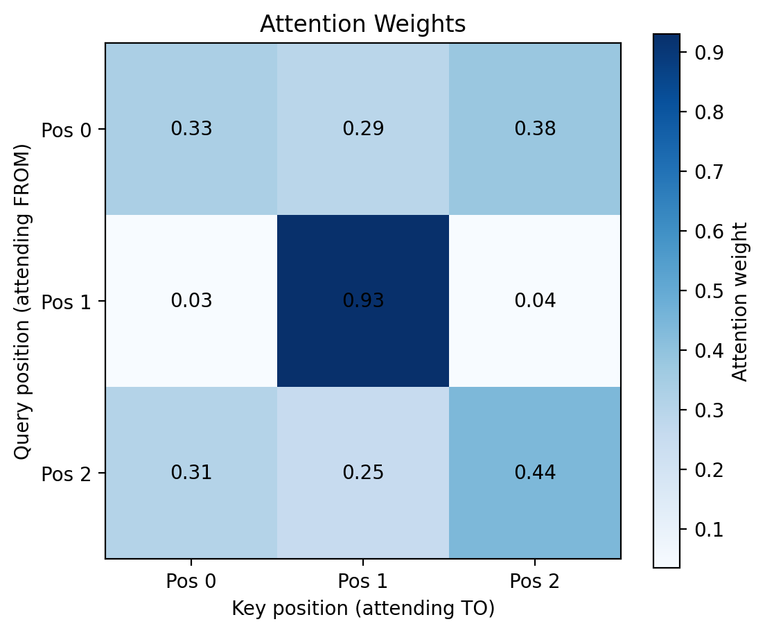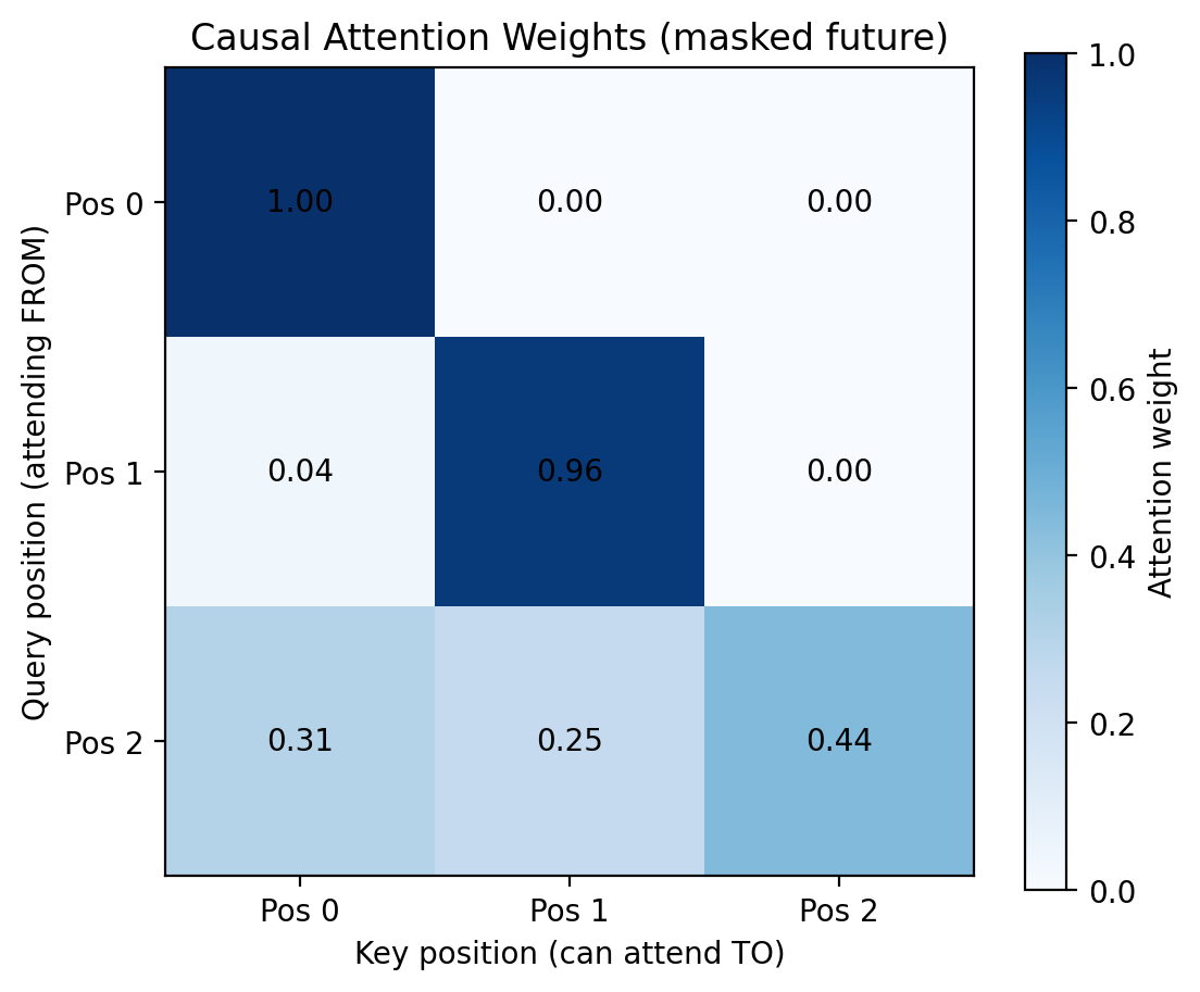 Notice: - Position 0 can only attend to itself (weight = 1.0) - Position 1 attends to positions 0 and 1 - Position 2 attends to all positions 0, 1, 2 - No position attends to the future!
