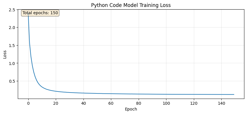 plt.figure(figsize=(10, 4))plt.plot(losses)plt.xlabel('Epoch')plt.ylabel('Loss')plt.title('Python Code Model Training Loss')plt.grid(True, alpha=0.3)# Show number of epochs trainedplt.text(0.02, 0.98, f'Total epochs: {len(losses)}', transform=plt.gca().transAxes, verticalalignment='top', bbox=dict(boxstyle='round', facecolor='wheat', alpha=0.5))plt.show()print(f"Training summary: {len(losses)} epochs completed, final loss: {losses[-1]:.4f}")
