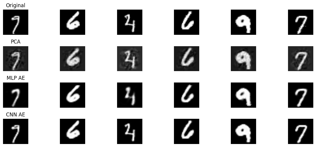 def show_reconstructions(original, pca, mlp, cnn, n=6):