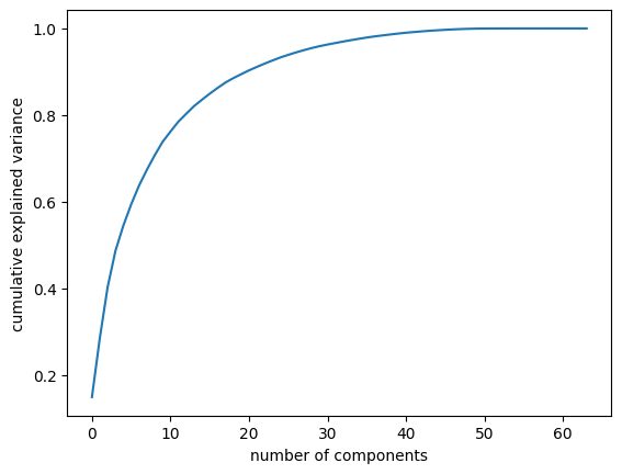 This curve quantifies how much of the total, 64-dimensional variance is contained within the first \(N\) components. For example, we see that with the digits data the first 10 components contain approximately 75% of the variance, while you need around 50 components to describe close to 100% of the variance.