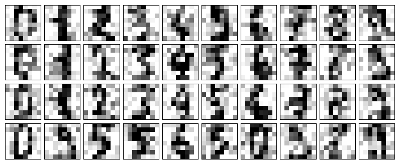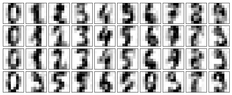 Here 50% of the variance amounts to 12 principal components, out of the 64 original features. Now we compute these components, and then use the inverse of the transform to reconstruct the filtered digits; the following figure shows the result: