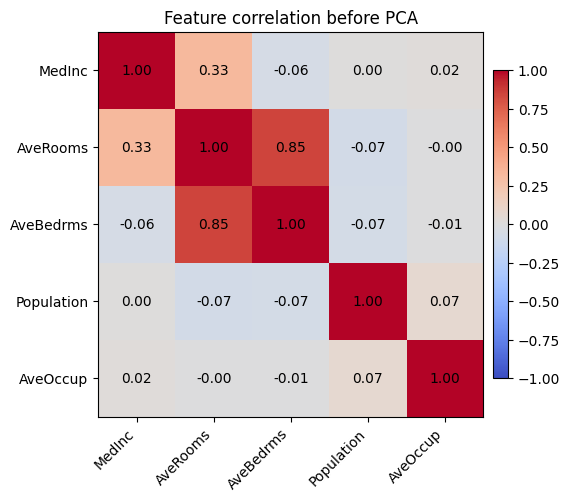 Many real-world tabular datasets contain strongly correlated (multicollinear) features, which can make linear models unstable. Here we revisit the California housing dataset to see how PCA re-expresses these features into uncorrelated components.
