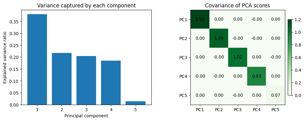 After scaling the features, PCA rotates them into orthogonal directions: the covariance matrix of the principal components is almost diagonal. This decorrelation is what removes multicollinearity—the downstream model now sees independent signals ordered by the variance they explain, and we can keep only the leading components if we want an even smaller, well-conditioned feature set.