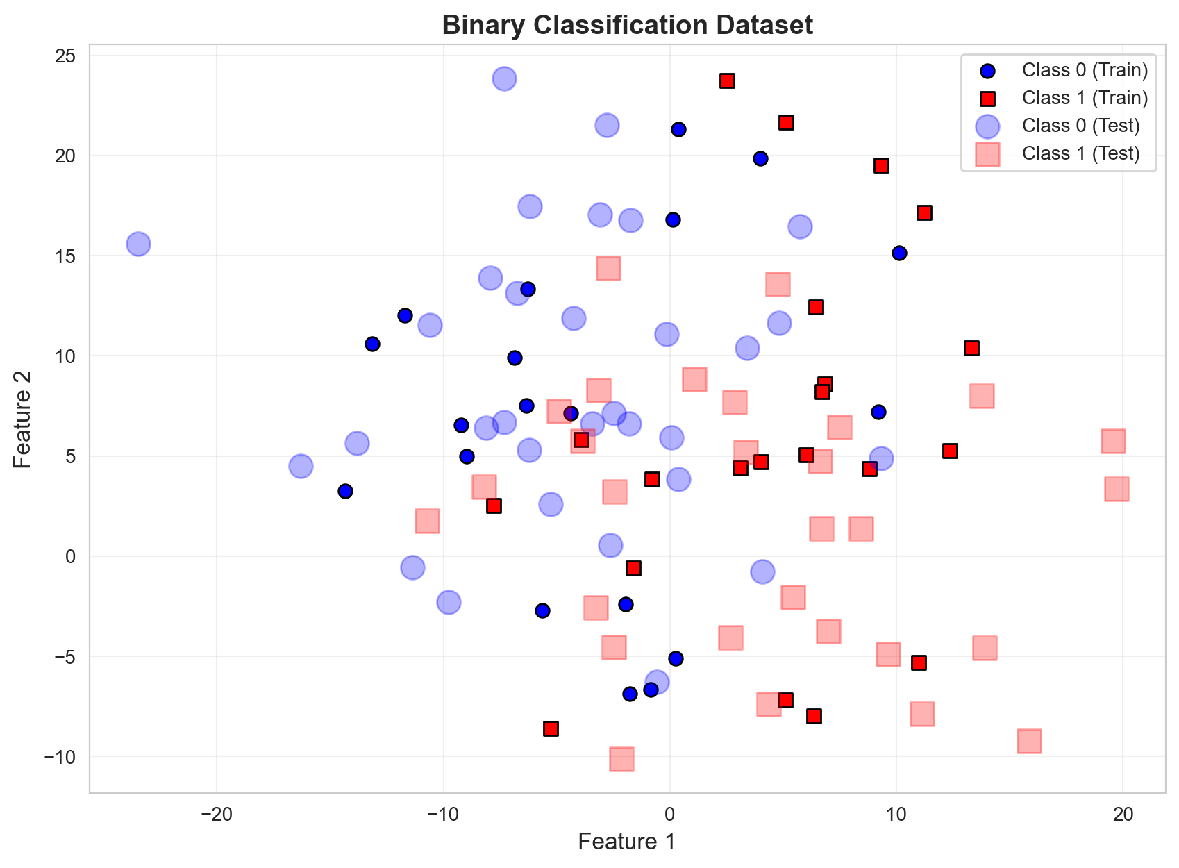 plt.scatter(X_train[y_train ='o', label='Class 0 (Train)', color='blue', s=50, edgecolors='k')