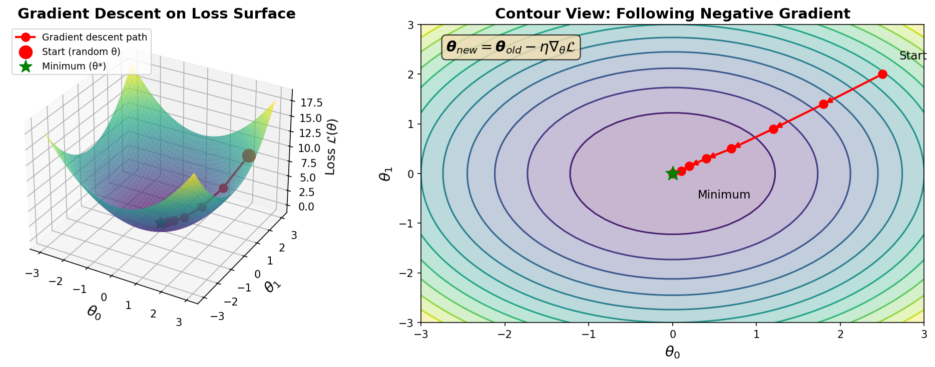 Key insight: Gradient points in direction of steepest increase. To minimize, go opposite to gradient!
