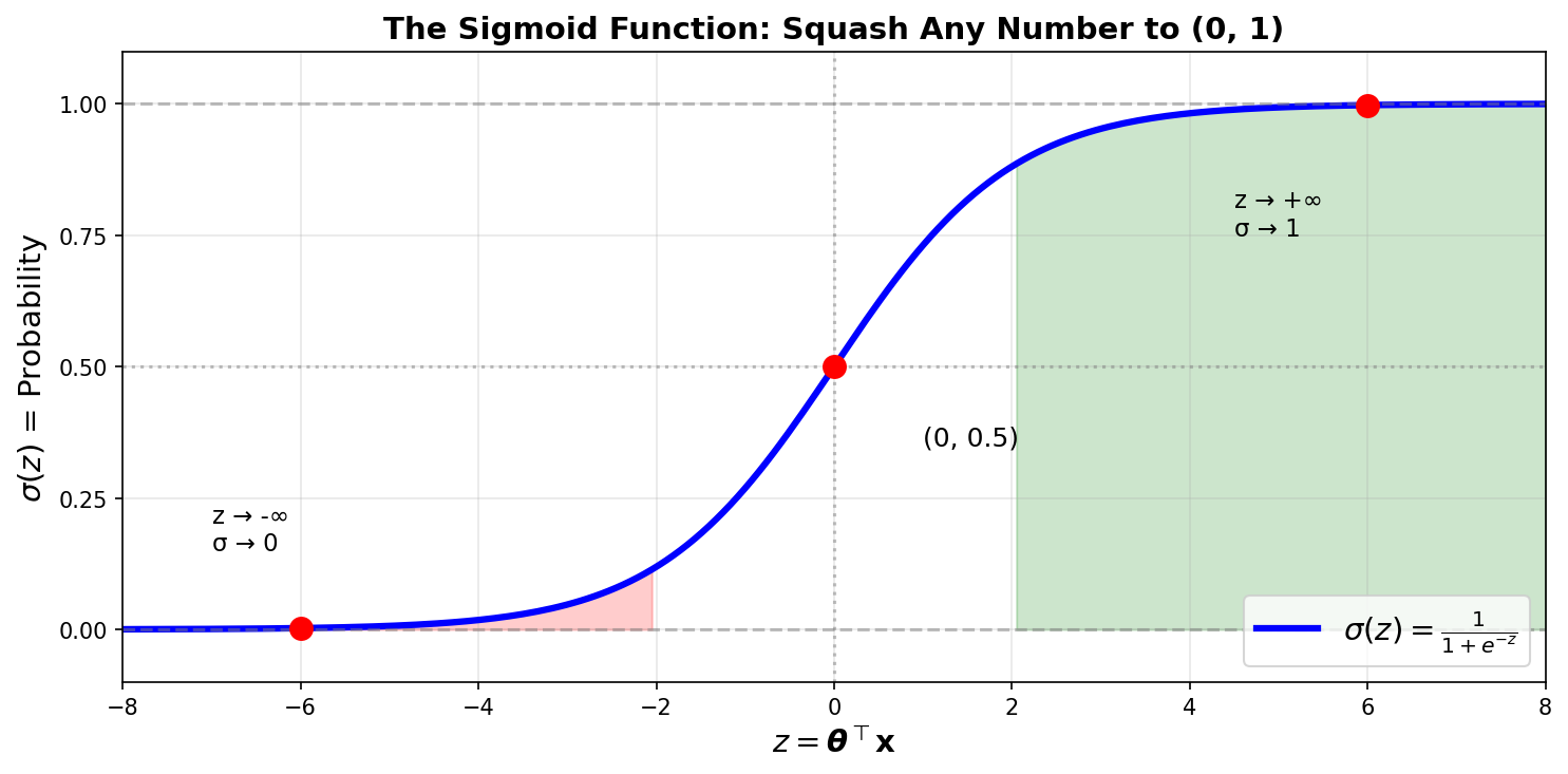 | z near 0 | Output changes rapidly (decision boundary) |