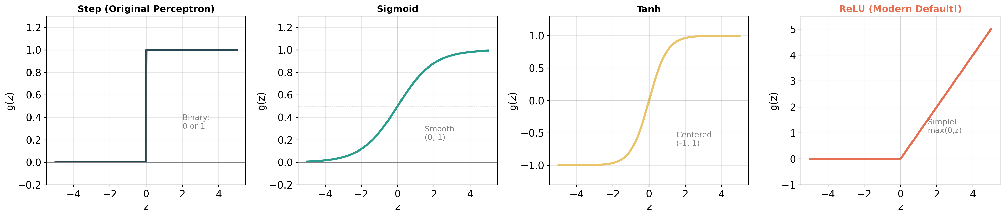 | Wide | 1 layer x 10,000 neurons | Can represent anything, but hard to train |