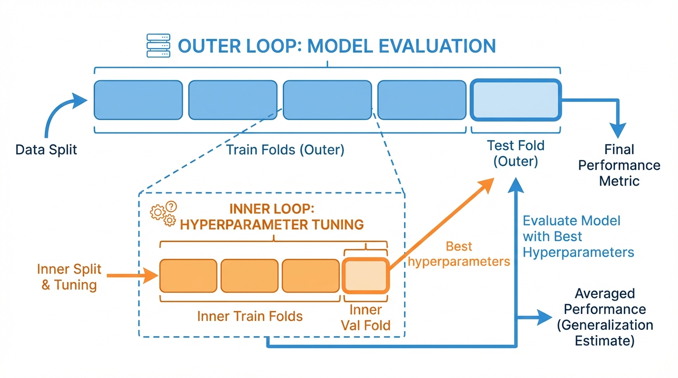 | Nested CV | Tune inside, evaluate outside |